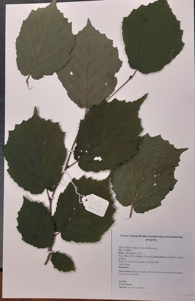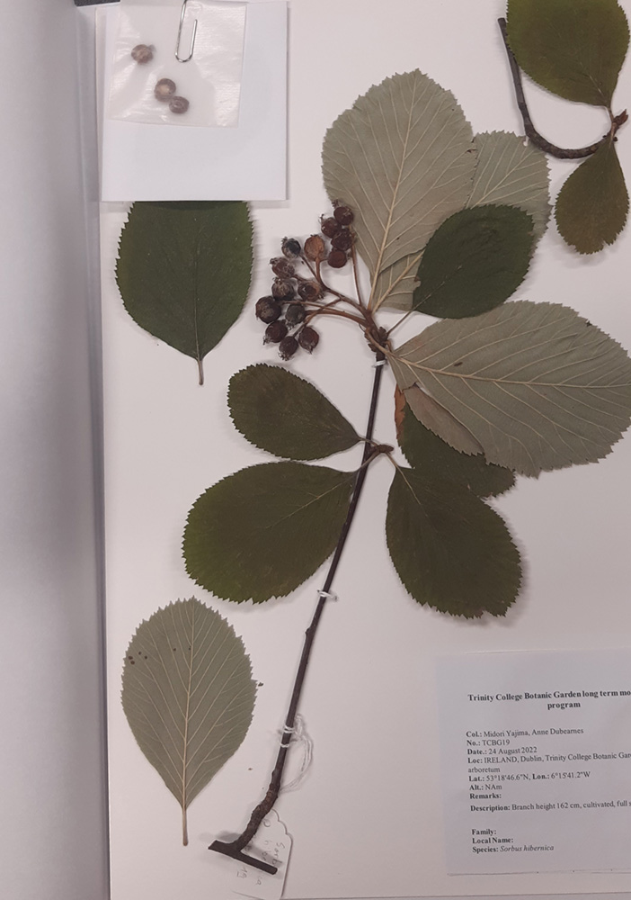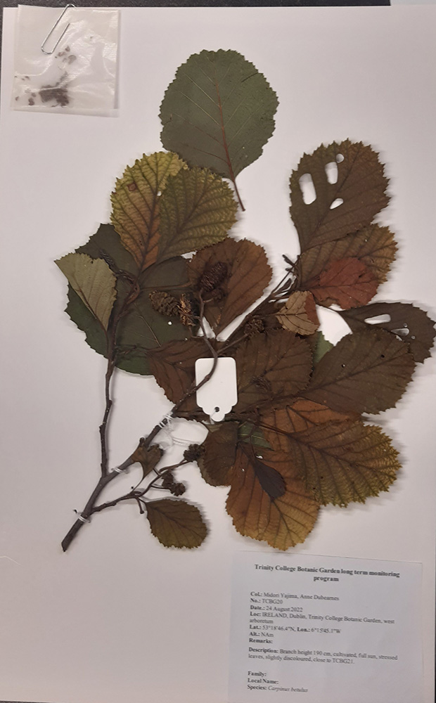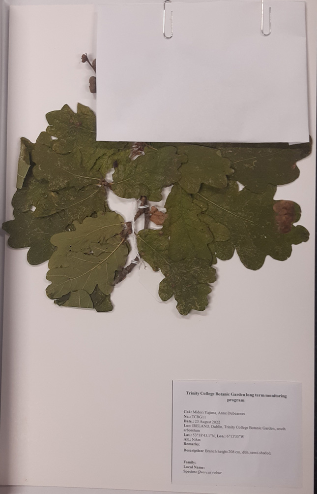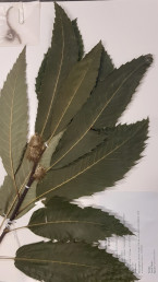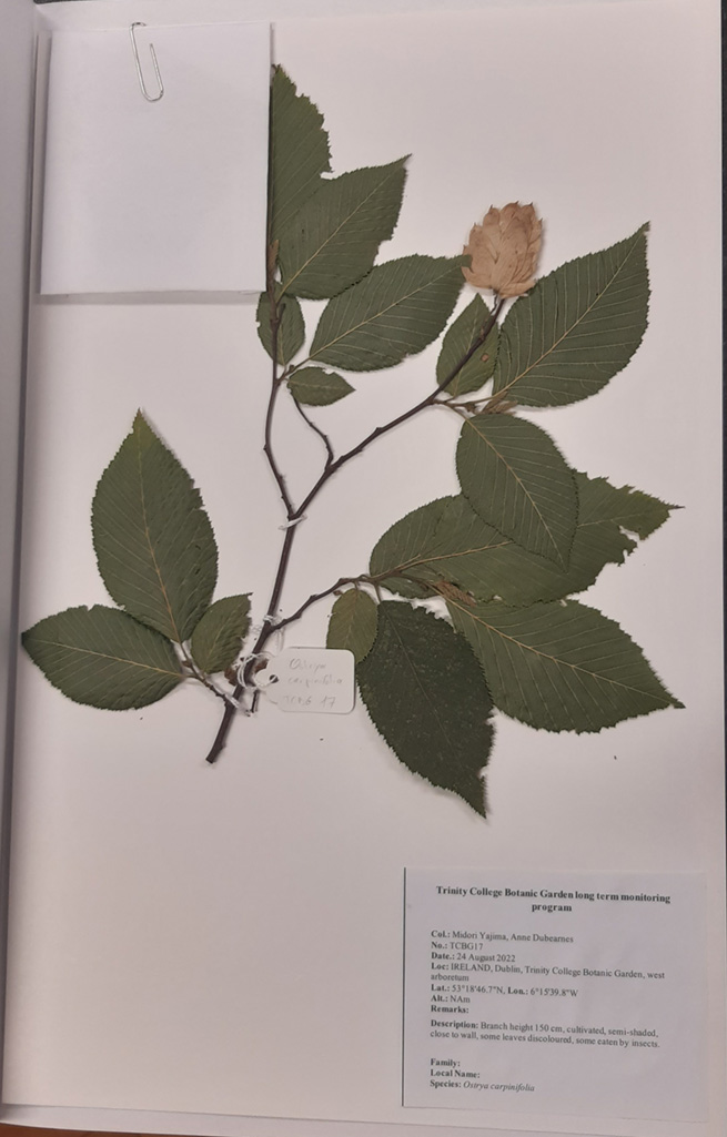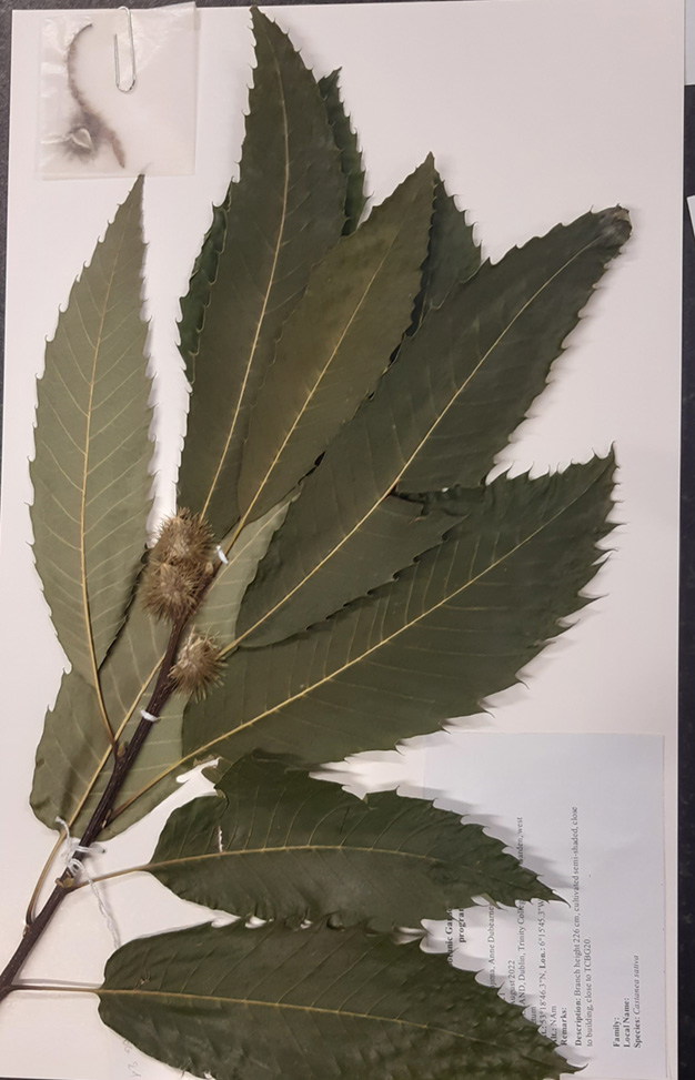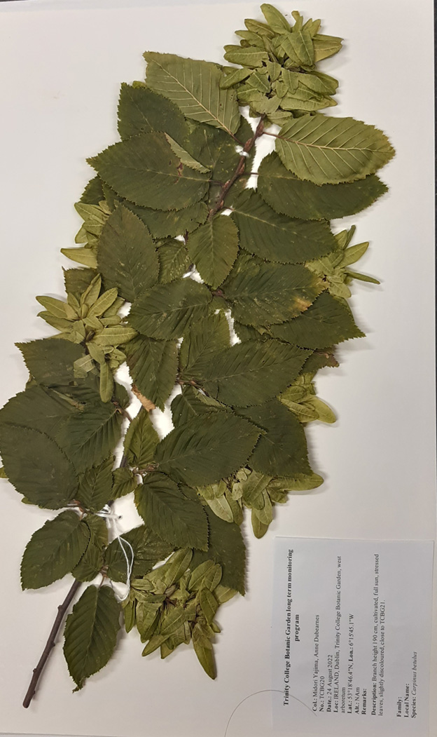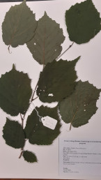 Below are examples of the herbarium specimens of the Witness Trees which were sampled, pressed and dried in 2022. The herbarium specimens are listed alphabetically, and you can view more details about each by clicking on the image or species name. The images are high resolution scans of the herbarium specimens showing the leaves, reproductive structures and detailed scientific labels. Some specimens have additional envelopes containing plants parts such as seeds or additional leaves for future study.