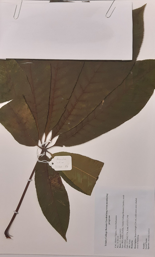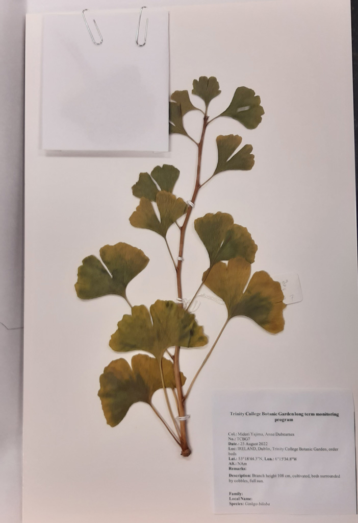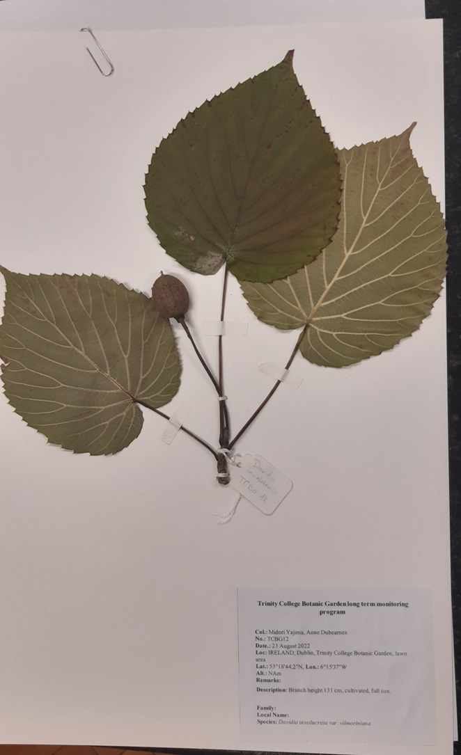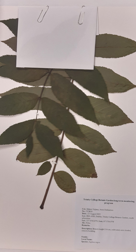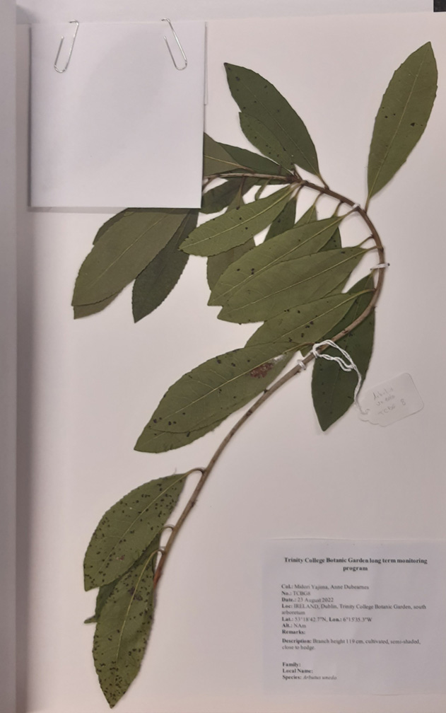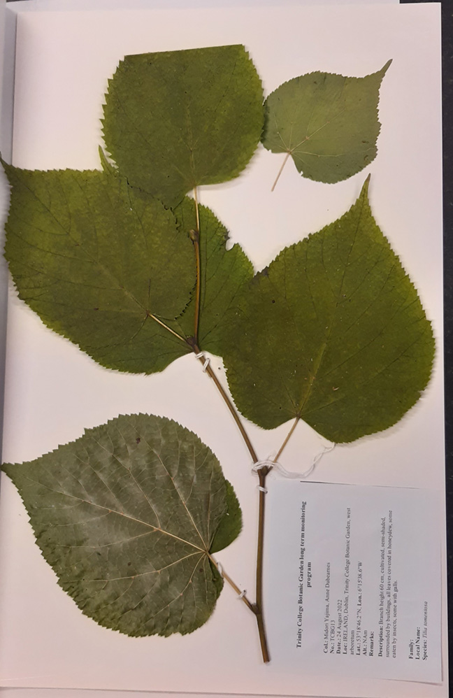 Below are examples of the herbarium specimens of the Witness Trees which were sampled, pressed and dried in 2022. The herbarium specimens are listed alphabetically, and you can view more details about each by clicking on the image or species name. The images are high resolution scans of the herbarium specimens showing the leaves, reproductive structures and detailed scientific labels. Some specimens have additional envelopes containing plants parts such as seeds or additional leaves for future study.